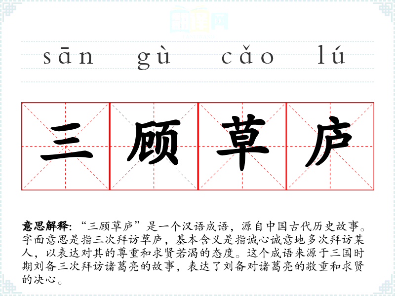 “三顾草庐”源自《三国志·蜀志·诸葛亮传》,记载了刘备三次拜访诸葛亮的故事。这个成语随着历史的发展,逐渐被用来形容对某人的尊重和执着追求。