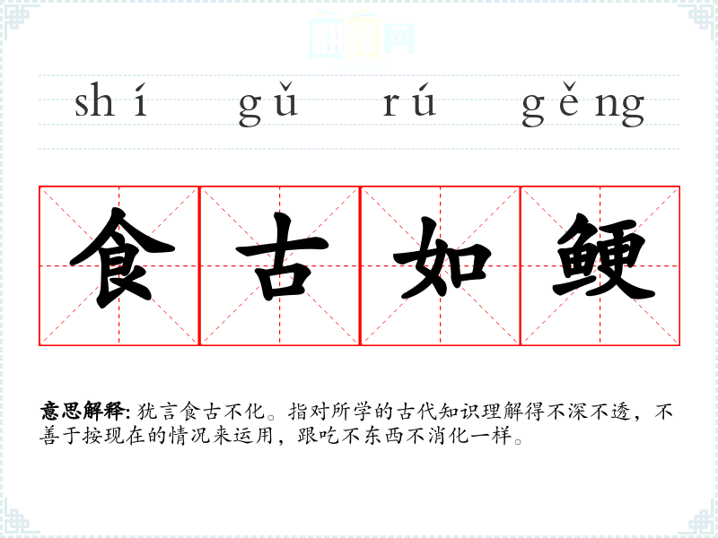 。指对所学的古代知识理解得不深不透,不善于按现在的情况来运用,跟吃不东西不消化一样。
