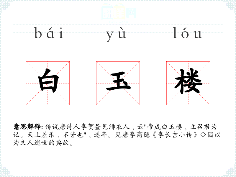 传说唐诗人李贺昼见绯衣人﹐云"帝成白玉楼﹐立召君为记。天上差乐﹐不苦也"﹐遂卒。见唐李商隐《李长吉小传》◇因以为文人逝世的典故。