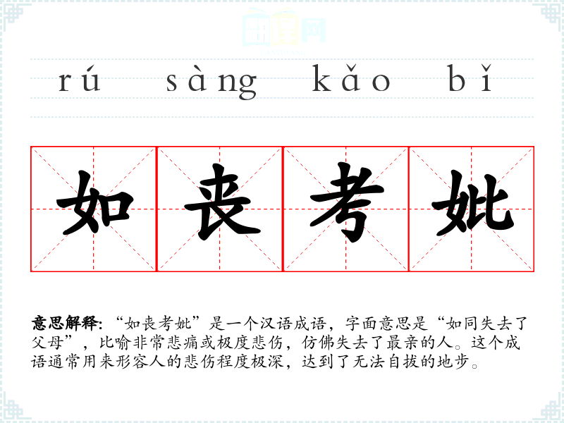 “如丧考妣”是一个汉语成语,字面意思是“如同失去了父母”,比喻非常悲痛或极度悲伤,仿佛失去了最亲的人。这个成语通常用来形容人的悲伤程度极深,达到了无法自拔的地步。