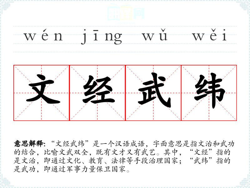 “文经武纬”是一个汉语成语,字面意思是指文治和武功的结合,比喻文武双全,既有文才又有武艺。其中,“文经”指的是文治,即通过文化、教育、法律等手段治理国家;“武纬”指的是武功,即通过军事力量保卫国家。