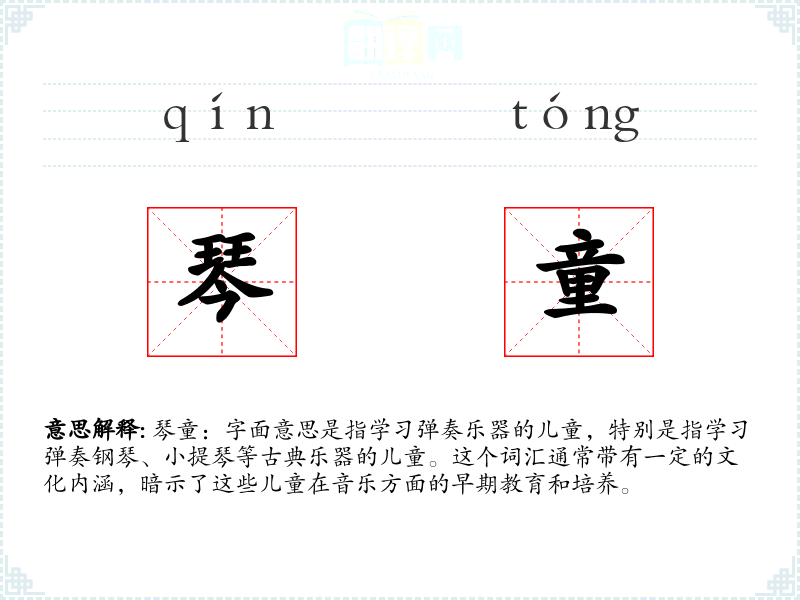 琴童:字面意思是指学弹奏乐器的儿童,特别是指学弹奏钢琴、小提琴等古典乐器的儿童。这个词汇通常带有一定的文化内涵,暗示了这些儿童在音乐方面的早期教育和培养。