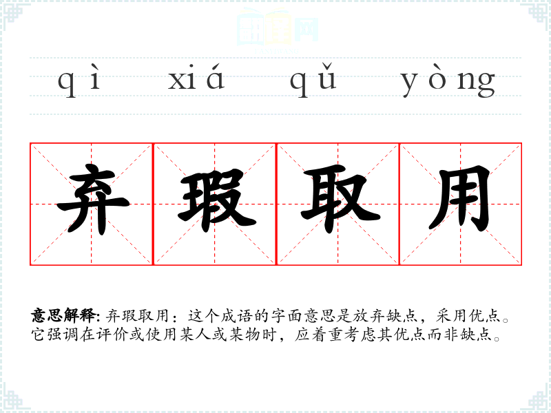 弃瑕取用:这个成语的字面意思是放弃缺点,采用优点。它强调在评价或使用某人或某物时,应着重考虑其优点而非缺点。