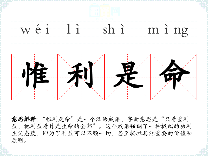 “惟利是命”是一个汉语成语,字面意思是“只看重利益,把利益看作是生命的全部”。这个成语强调了一种极端的功利主义态度,即为了利益可以不顾一切,甚至牺牲其他重要的价值和原则。
