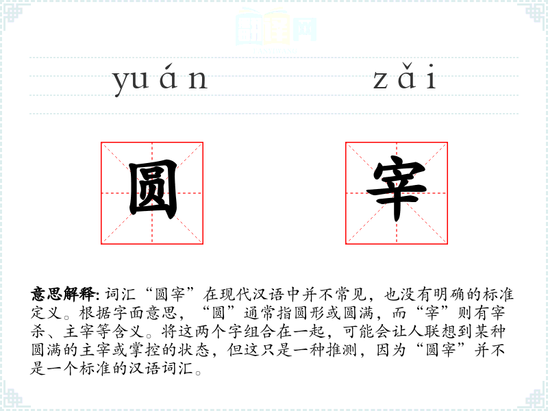 由于“圆宰”不是一个标准词汇,我们无法给出一个确切的基本定义。它可能是一个特定领域或方言中的词汇,或者是某个特定文本中的创造性用法。
