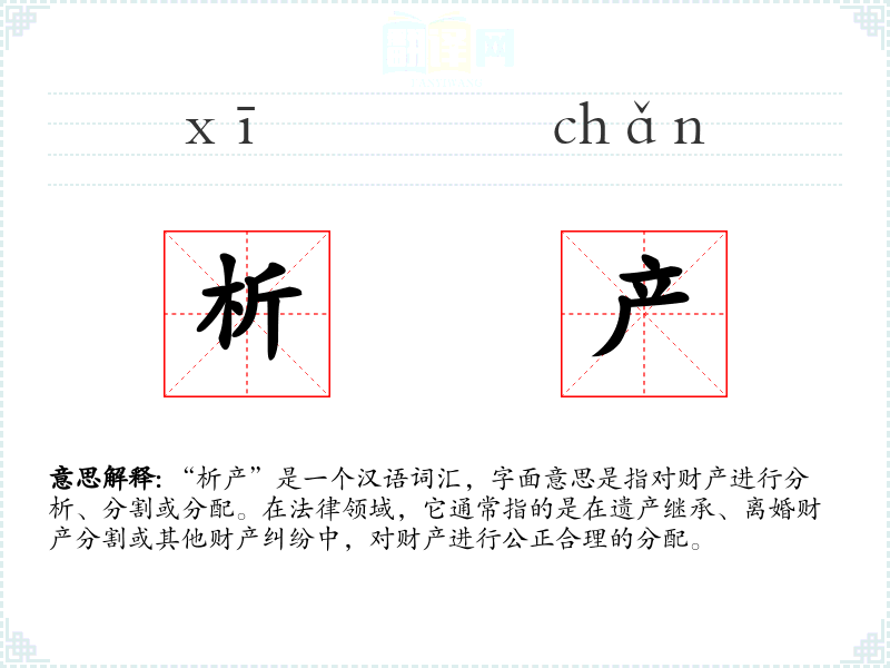 - 专业领域:在法律和财务领域,“析产”是一个专业术语,用于描述财产分割的具体过程和法律程序。