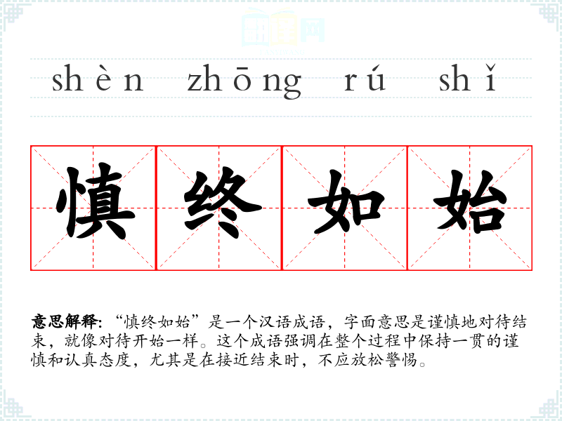 “慎终如始”是一个富有哲理的成语,它不仅提醒我们在做事情时要保持一贯的谨慎态度,也反映了中华文化中对于持续性和稳定性的重视。在个人成长和职业发展中,这个成语都是一个宝贵的指导原则。