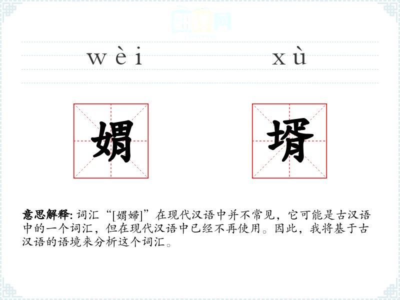 词汇“[媦婦]”在现代汉语中并不常见,它可能是古汉语中的一个词汇,但在现代汉语中已经不再使用。因此,我将基于古汉语的语境来分析这个词汇。