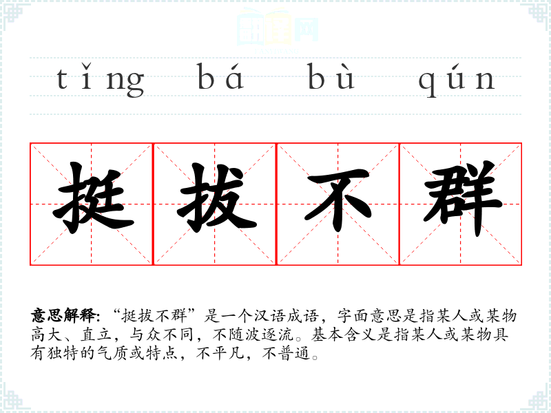 “挺拔不群”是一个汉语成语,字面意思是指某人或某物高大、直立,与众不同,不随波逐流。基本含义是指某人或某物具有独特的气质或特点,不平凡,不普通。