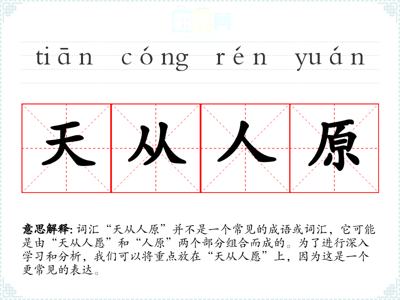 词汇“天从人原”并不是一个常见的成语或词汇,它可能是由“天从人愿”和“人原”两个部分组合而成的。为了进行深入学*和分析,我们可以将重点放在“天从人愿”上,因为这是一个更常见的表达。
