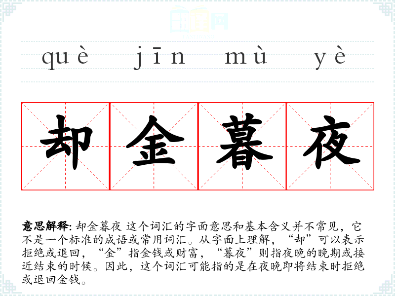 却金暮夜 这个词汇的字面意思和基本含义并不常见,它不是一个标准的成语或常用词汇。从字面上理解,“却”可以表示拒绝或退回,“金”指金钱或财富,“暮夜”则指夜晚的晚期或接近结束的时候。因此,这个词汇可能指的是在夜晚即将结束时拒绝或退回金钱。