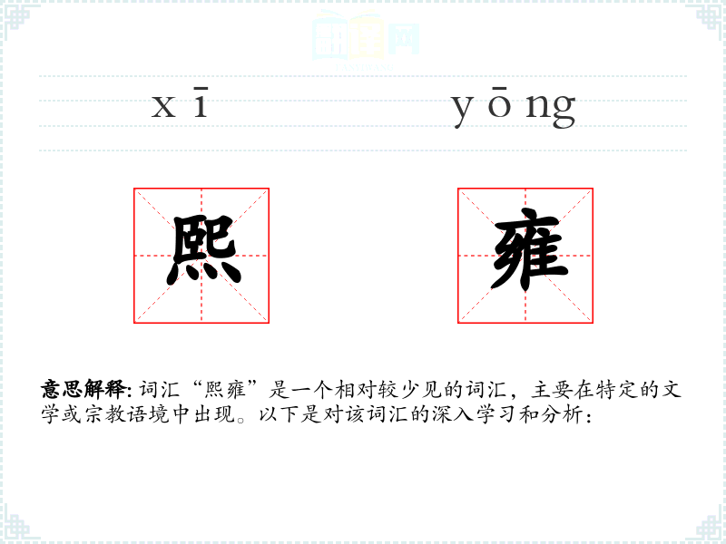 词汇“熙雍”是一个相对较少见的词汇,主要在特定的文学或*语境中出现。以下是对该词汇的深入学和分析: