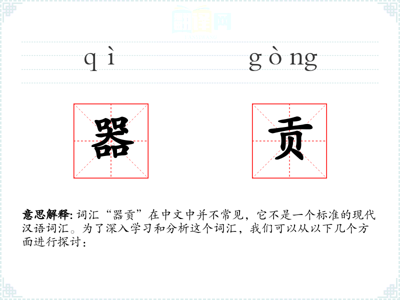 词汇“器贡”在中文中并不常见,它不是一个标准的现代汉语词汇。为了深入学*和分析这个词汇,我们可以从以下几个方面进行探讨: