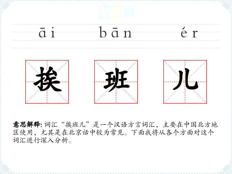 词汇“挨班儿”是一个汉语方言词汇,主要在**北方地区使用,尤其是在北京话中较为常见。下面我将从各个方面对这个词汇进行深入分析。