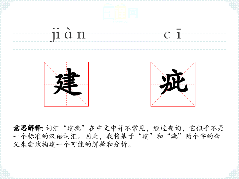 词汇“建疵”在中文中并不常见,经过查询,它似乎不是一个标准的汉语词汇。因此,我将基于“建”和“疵”两个字的含义来尝试构建一个可能的解释和分析。