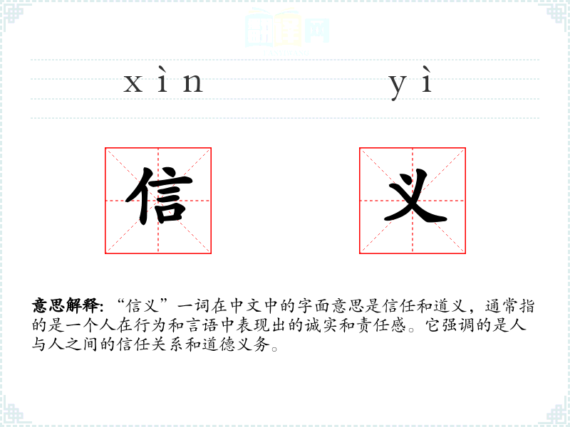 “信义”一词在中文中的字面意思是信任和道义,通常指的是一个人在行为和言语中表现出的诚实和责任感。它强调的是人与人之间的信任关系和道德义务。
