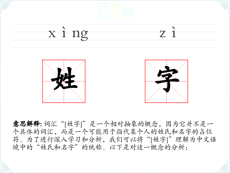 - 反义词:无,因为“[姓字]”是一个中性概念,没有直接的反义词。