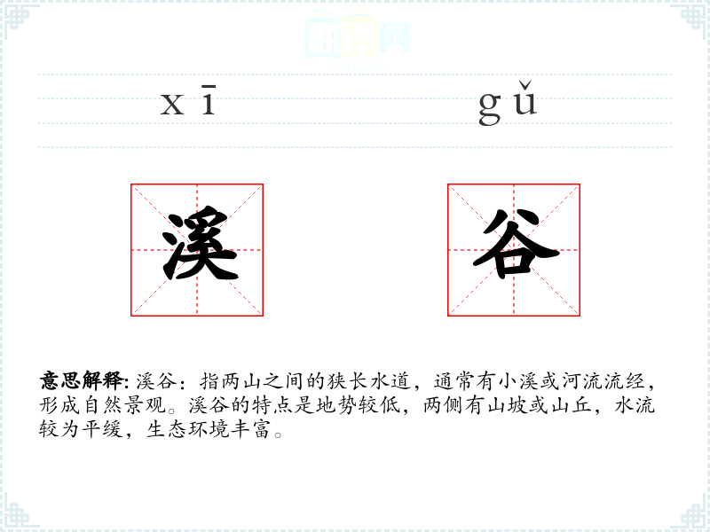 溪谷一词由“溪”和“谷”两个字组成。“溪”指小河,“谷”指两山之间的低地。在古代汉语中,溪谷常用来描述自然地形,随着时间的推移,其含义和用法基本保持不变。