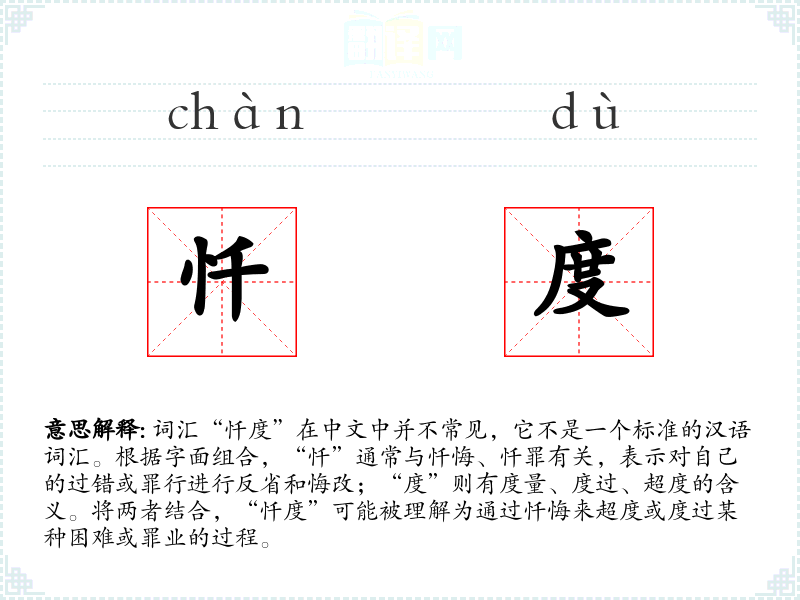 词汇“忏度”在中文中并不常见,它不是一个标准的汉语词汇。根据字面组合,“忏”通常与忏悔、忏罪有关,表示对自己的过错或罪行进行反省和悔改;“度”则有度量、度过、超度的含义。将两者结合,“忏度”可能被理解为通过忏悔来超度或度过某种困难或罪业的过程。