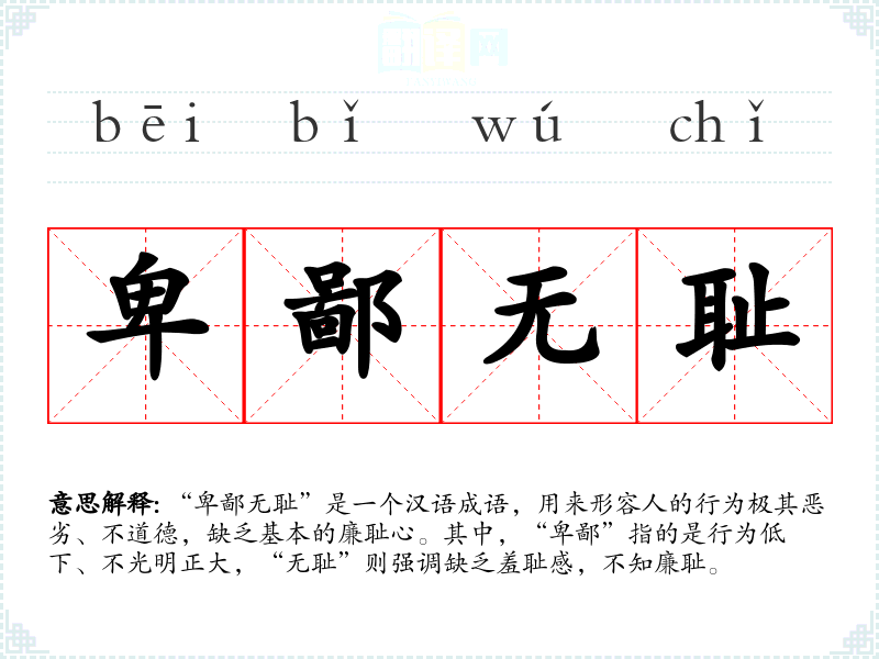 “卑鄙无耻”是一个汉语成语,用来形容人的行为极其恶劣、不道德,缺乏基本的廉耻心。其中,“卑鄙”指的是行为低下、不光明正大,“无耻”则强调缺乏羞耻感,不知廉耻。