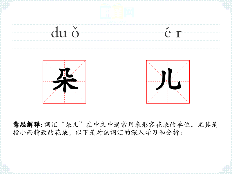 词汇“朵儿”在中文中通常用来形容花朵的单位,尤其是指小而精致的花朵。以下是对该词汇的深入学*和分析:
