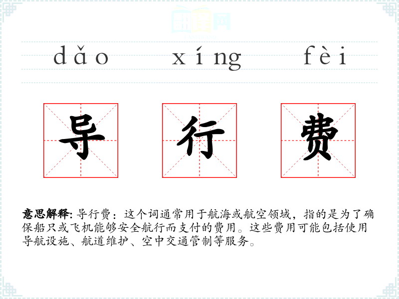 导行费:这个词通常用于航海或航空领域,指的是为了确保船只或飞机能够安全航行而支付的费用。这些费用可能包括使用导航设施、航道维护、空中交通管制等服务。