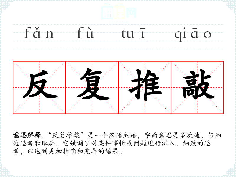 “反复推敲”是一个汉语成语,字面意思是多次地、仔细地思考和琢磨。它强调了对某件事情或问题进行深入、细致的思考,以达到更加精确和完善的结果。