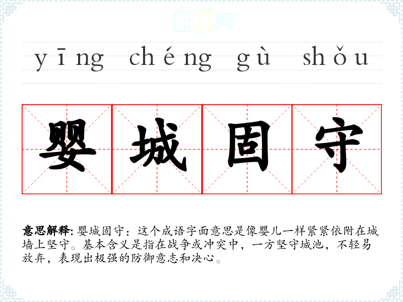 婴城固守:这个成语字面意思是像婴儿一样紧紧依附在城墙上坚守。基本含义是指在战争或冲突中,一方坚守城池,不轻易放弃,表现出极强的防御意志和决心。
