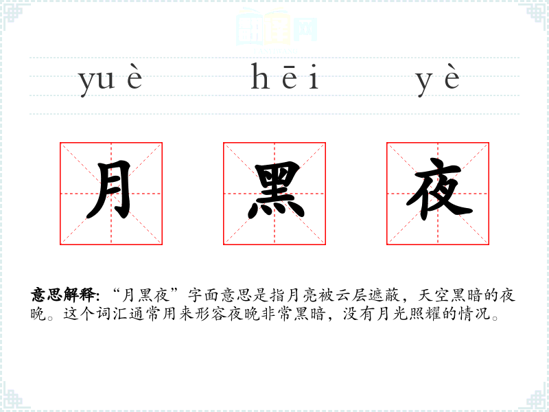 “月黑夜”字面意思是指月亮被云层遮蔽,天空黑暗的夜晚。这个词汇通常用来形容夜晚非常黑暗,没有月光照耀的情况。
