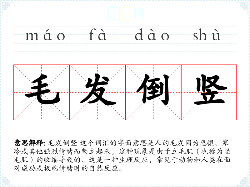 毛发倒竖 这个词汇的字面意思是人的毛发因为恐惧、寒冷或其他强烈情绪而竖立起来。这种现象是由于立毛肌(也称为竖毛肌)的收缩导致的,这是一种生理反应,常见于动物和人类在面对威胁或极端情绪时的自然反应。