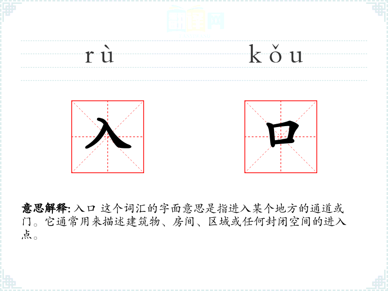 “入口”一词源自汉语,由“入”和“口”两个字组成。在古代汉语中,“入”表示进入,“口”表示通道或开口,合起来即表示进入的通道。随着语言的发展,这个词的用法和含义基本保持稳定。
