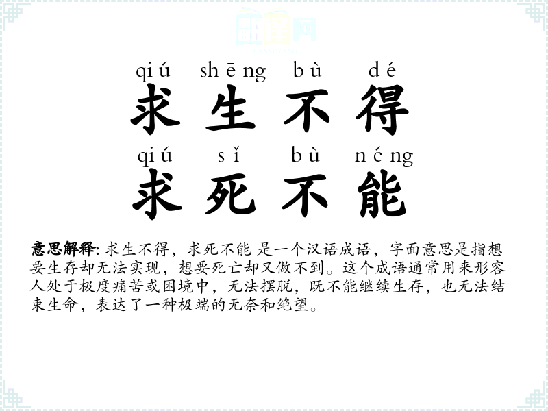 求生不得,求死不能 是一个汉语成语,字面意思是指想要生存却无法实现,想要死亡却又做不到。这个成语通常用来形容人处于极度痛苦或困境中,无法摆脱,既不能继续生存,也无法结束生命,表达了一种极端的无奈和绝望。