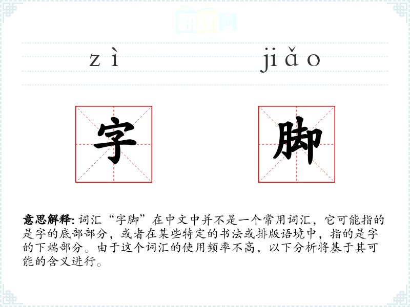 词汇“字脚”在中文中并不是一个常用词汇,它可能指的是字的底部部分,或者在某些特定的书法或排版语境中,指的是字的下端部分。由于这个词汇的使用频率不高,以下分析将基于其可能的含义进行。