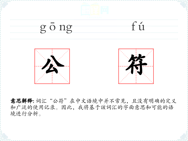 词汇“公符”在中文语境中并不常见,且没有明确的定义和广泛的使用记录。因此,我将基于该词汇的字面意思和可能的语境进行分析。