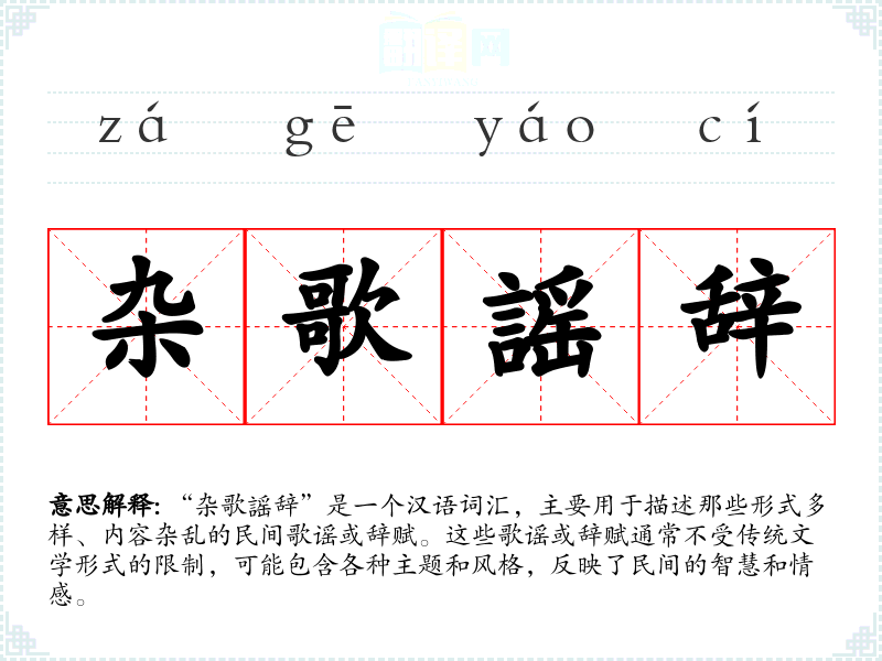 “杂歌謡辞”是一个汉语词汇,主要用于描述那些形式多样、内容杂乱的民间歌谣或辞赋。这些歌谣或辞赋通常不受传统文学形式的限制,可能包含各种主题和风格,反映了民间的智慧和情感。