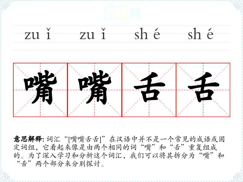 词汇“[嘴嘴舌舌]”在汉语中并不是一个常见的成语或固定词组,它看起来像是由两个相同的词“嘴”和“舌”重复组成的。为了深入学*和分析这个词汇,我们可以将其拆分为“嘴”和“舌”两个部分来分别探讨。