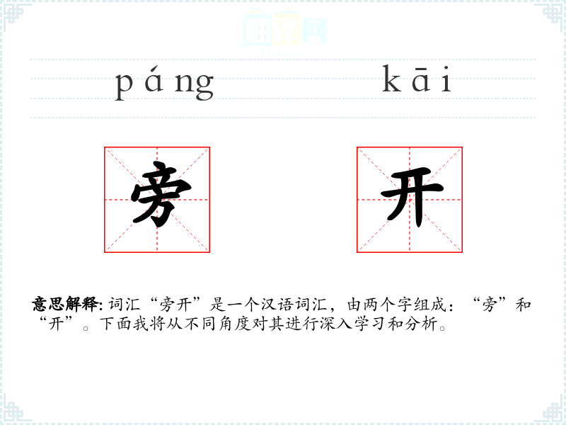 词汇“旁开”是一个汉语词汇,由两个字组成:“旁”和“开”。下面我将从不同角度对其进行深入学*和分析。