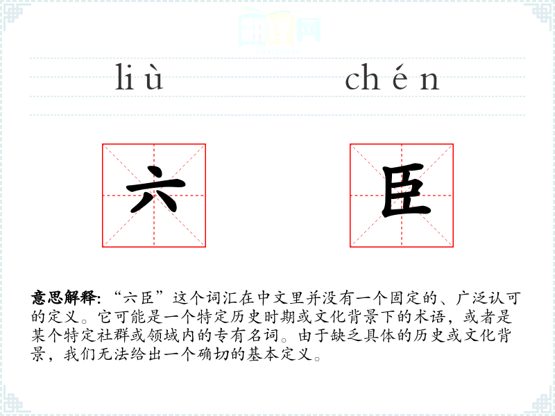 “六臣”这个词汇在中文里并没有一个固定的、广泛认可的定义。它可能是一个特定历史时期或文化背景下的术语,或者是某个特定社群或领域内的专有名词。由于缺乏具体的历史或文化背景,我们无法给出一个确切的基本定义。