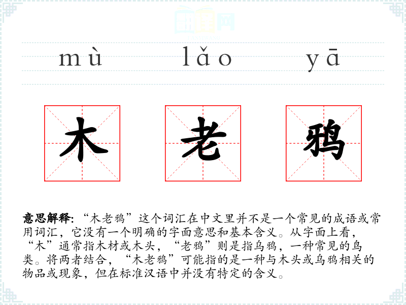 “木老鸦”这个词汇在中文里并不是一个常见的成语或常用词汇,它没有一个明确的字面意思和基本含义。从字面上看,“木”通常指木材或木头,“老鸦”则是指乌鸦,一种常见的鸟类。将两者结合,“木老鸦”可能指的是一种与木头或乌鸦相关的物品或现象,但在标准汉语中并没有特定的含义。