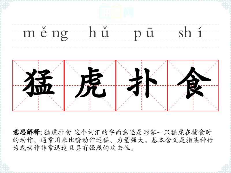 猛虎扑食 这个词汇在语言学和表达中具有重要的意义,它不仅能够形象地描述动作的迅猛和力量,还能够激发人们的情感和联想,增强语言的表现力。通过深入学和分析这个词汇,我更加理解了它在不同语境中的应用和重要性。