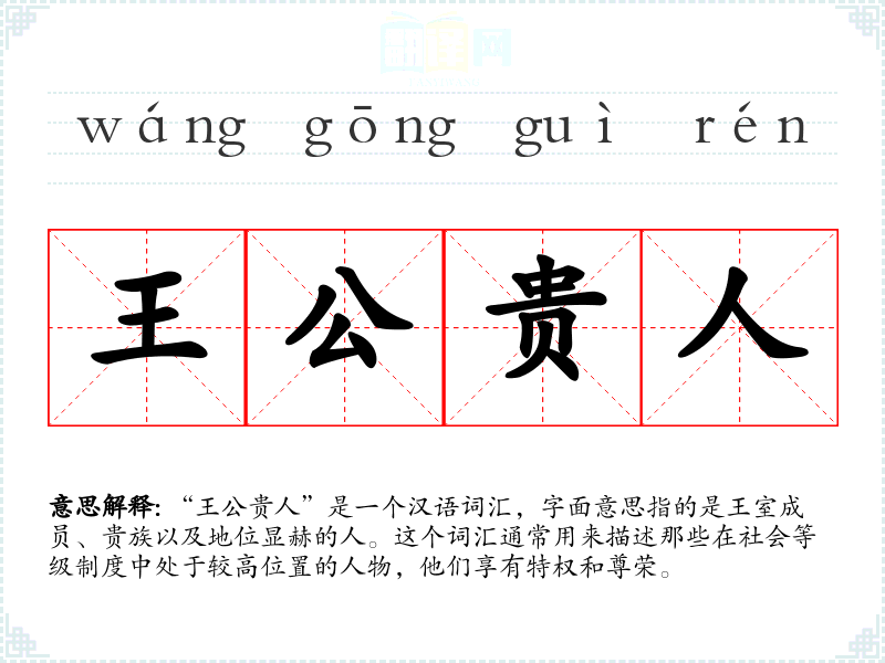 “王公贵人”是一个汉语词汇,字面意思指的是王室成员、贵族以及地位显赫的人。这个词汇通常用来描述那些在社会等级制度中处于较高位置的人物,他们享有特权和尊荣。