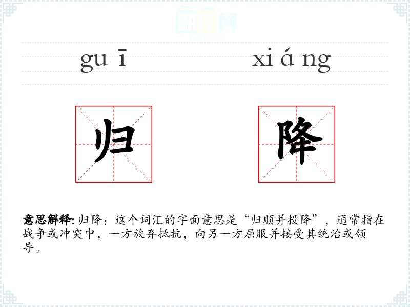 在英语中,“归降”可以对应为“surrender”或“capitulate”,这些词汇在西方文化中也有类似的含义和用法。