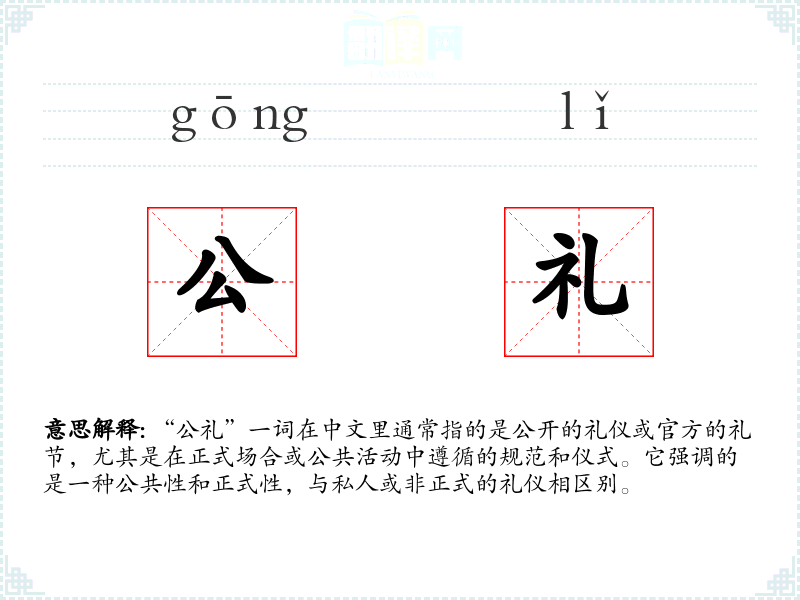 “公礼”一词在中文里通常指的是公开的礼仪或官方的礼节,尤其是在正式场合或公共活动中遵循的规范和仪式。它强调的是一种公共性和正式性,与私人或非正式的礼仪相区别。