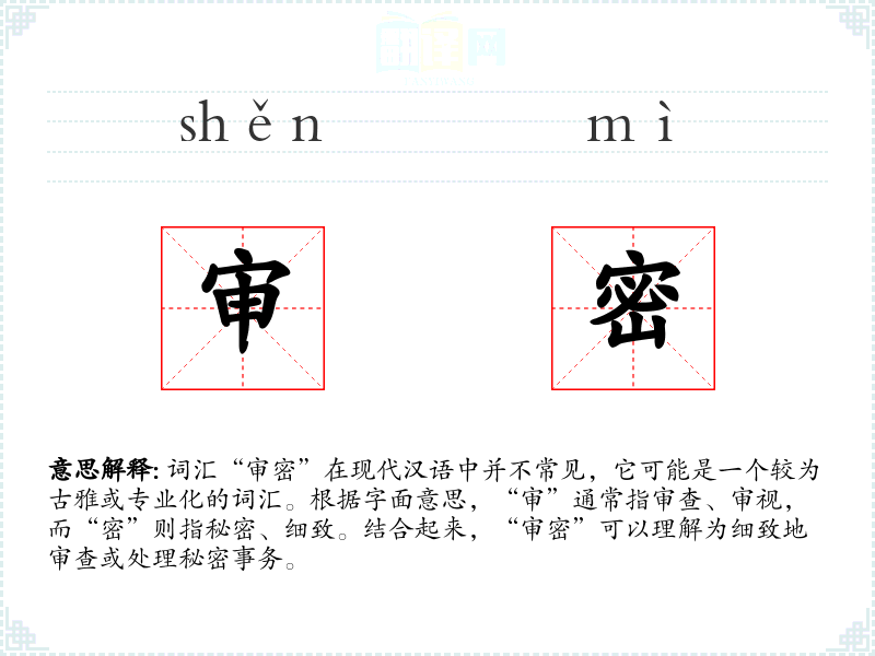 - 词源:“审”和“密”都是古代汉语中常用的词汇,组合起来形成“审密”这个复合词。