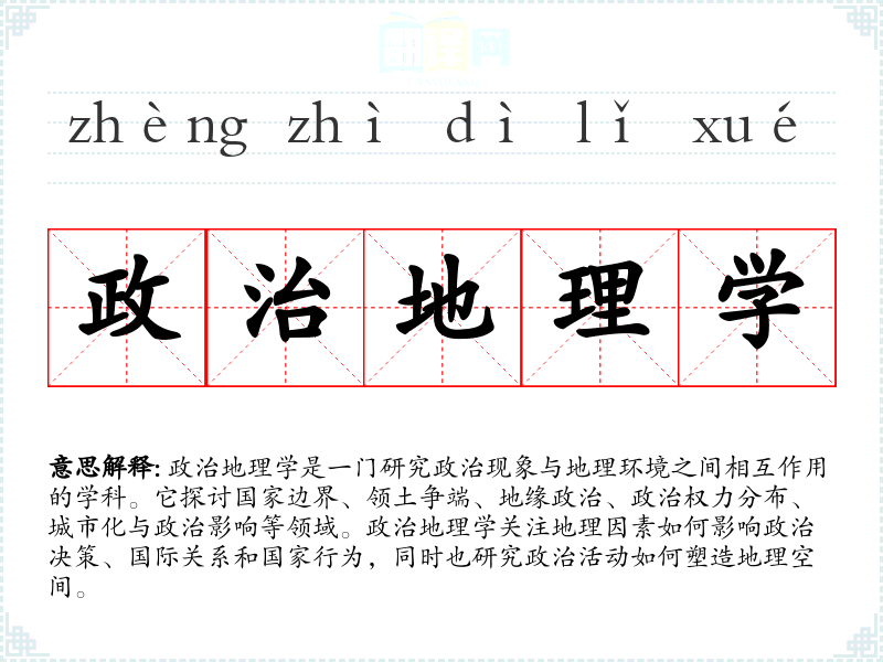 同义词:地缘政治学、政治空间分析 反义词:自然地理学(强调自然环境而非政治因素)