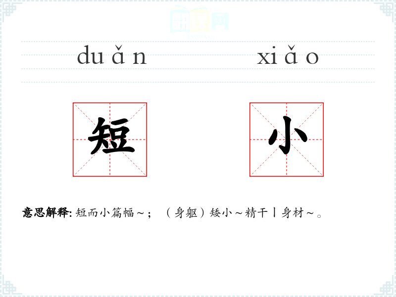 短而小篇幅~; (身躯)矮小~精干ㄧ身材~。