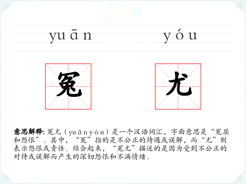 “冤尤”一词源自古代汉语,其中“冤”字最早见于《说文解字》,意为“鸟被网住”,引申为被束缚、受困。“尤”字则有“特别”、“责怪”之意。随着语言的发展,这两个字结合形成了“冤尤”,专门用来描述因不公而产生的怨恨情绪。