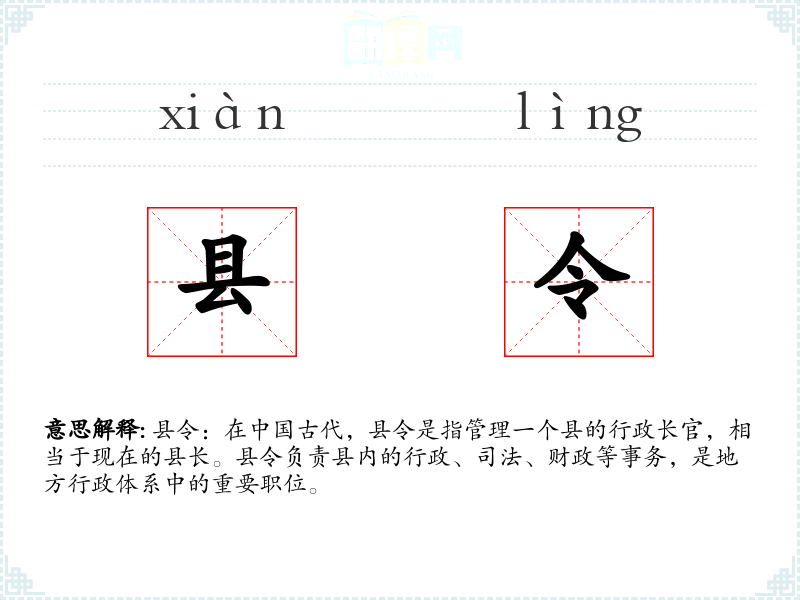 总结:县令作为古代地方行政长官的称谓,不仅体现了古代的行政体系,也反映了社会文化和价值观念。通过对县令这一词汇的学*和分析,可以更深入地理解**历史和文化。