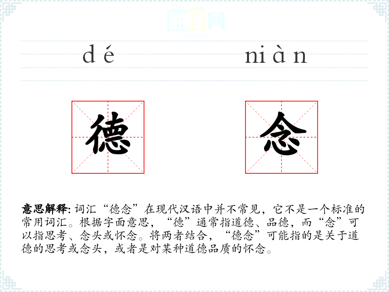 词汇“德念”在现代汉语中并不常见,它不是一个标准的常用词汇。根据字面意思,“德”通常指道德、品德,而“念”可以指思考、念头或怀念。将两者结合,“德念”可能指的是关于道德的思考或念头,或者是对某种道德品质的怀念。