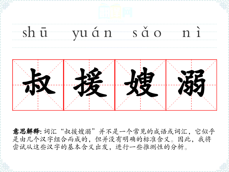 词汇“叔援嫂溺”并不是一个常见的成语或词汇,它似乎是由几个汉字组合而成的,但并没有明确的标准含义。因此,我将尝试从这些汉字的基本含义出发,进行一些推测性的分析。